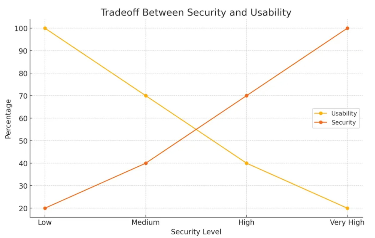 Above graph is perfect example of a usability vs security. Keep system complex, no one use it. Keep it too simple and everyone exploits.